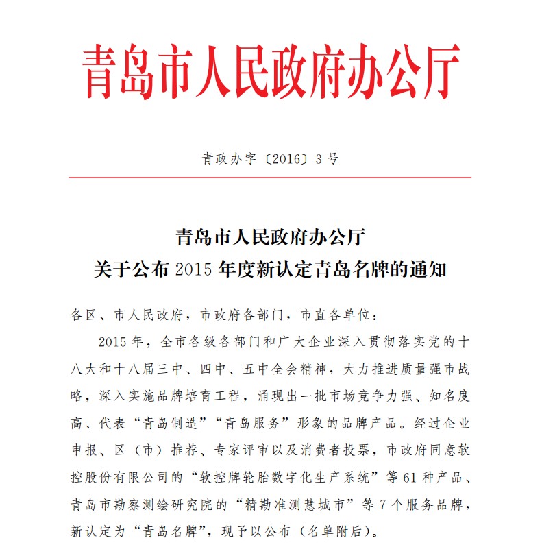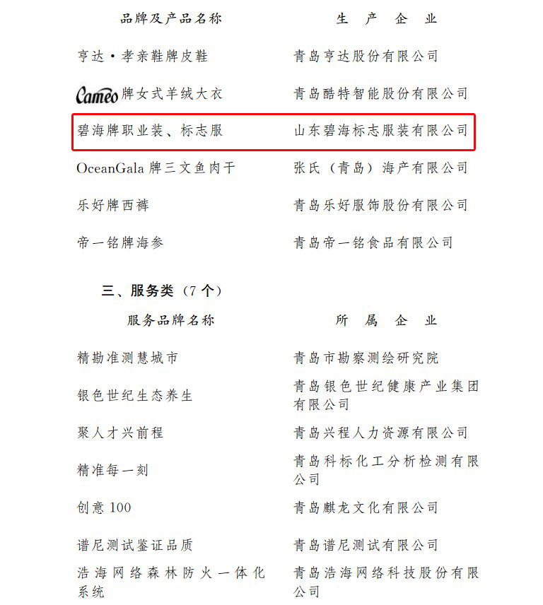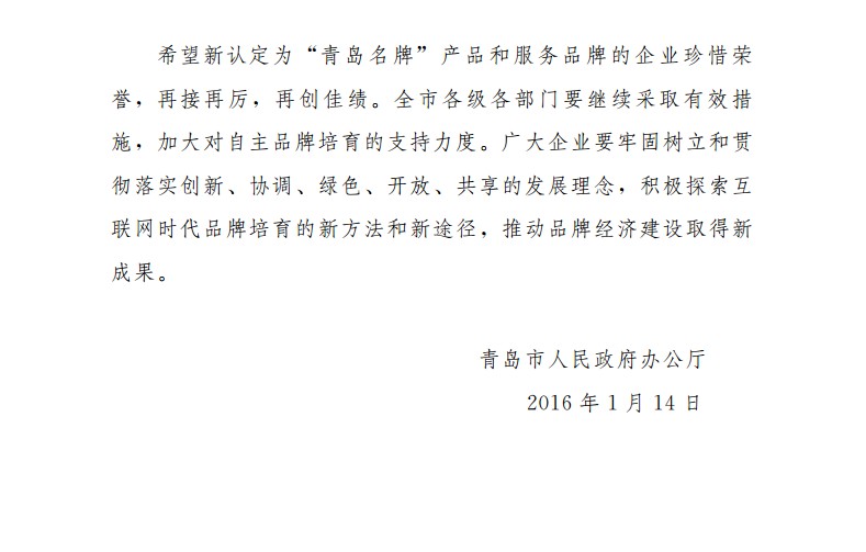 青岛市人民政府办公厅将市北区青青林浩服装行认定青岛名牌通知